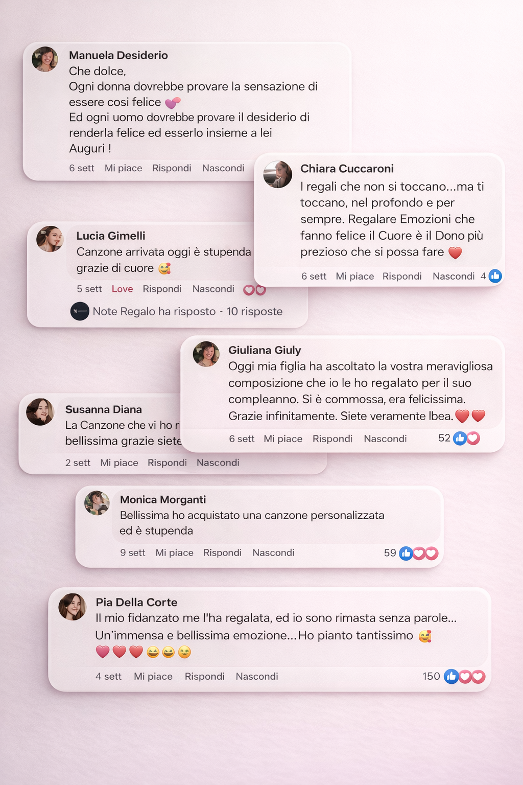 "Per il compleanno di mia madre, volevo trovare qualcosa di unico e significativo che potesse esprimere quanto fosse speciale per me. Note Regalo è stata la scelta perfetta. La canzone personalizzata che hanno creato per lei è stata meravigliosa e toccante, catturando perfettamente la nostra relazione e i momenti indimenticabili che abbiamo condiviso. Vedere le lacrime di gioia di mia madre mentre ascoltava la canzone è stato un momento impagabile. Note Regalo ha trasformato un semplice regalo in un ricordo che custodiremo per sempre. Sono immensamente grata per questo straordinario servizio!"
